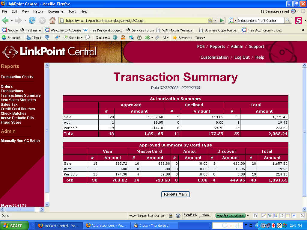 Screenshot of merchant account from 7/22/08 to 7/23/08