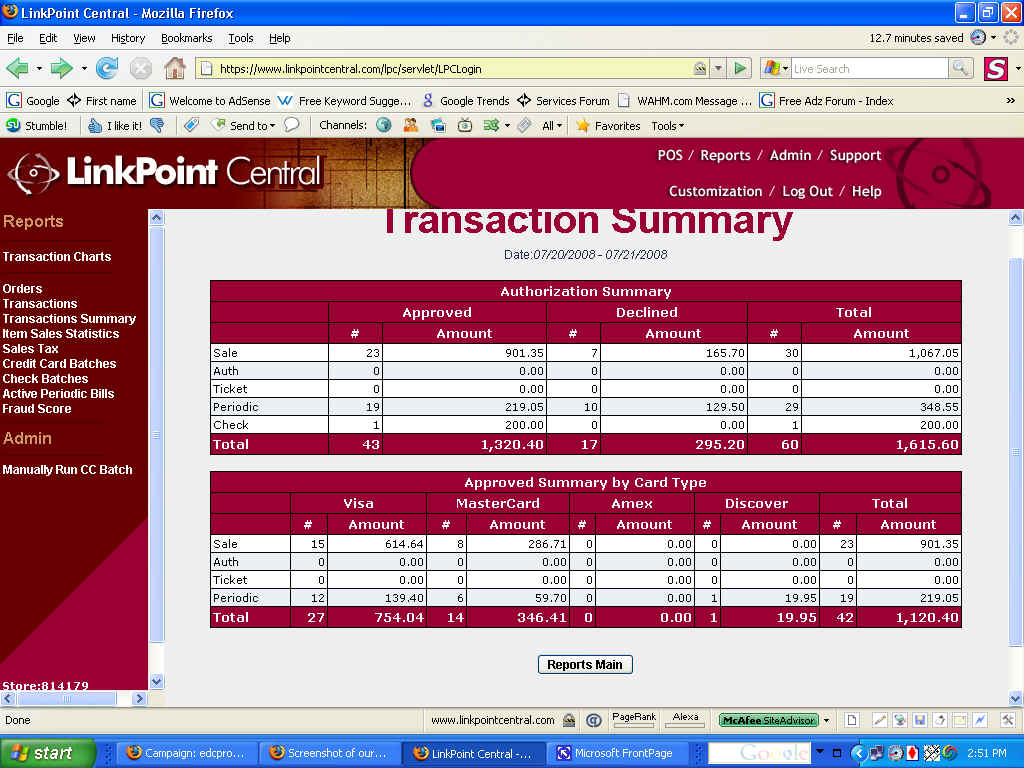 Screenshot of our merchant account 7/20 to 7/21
